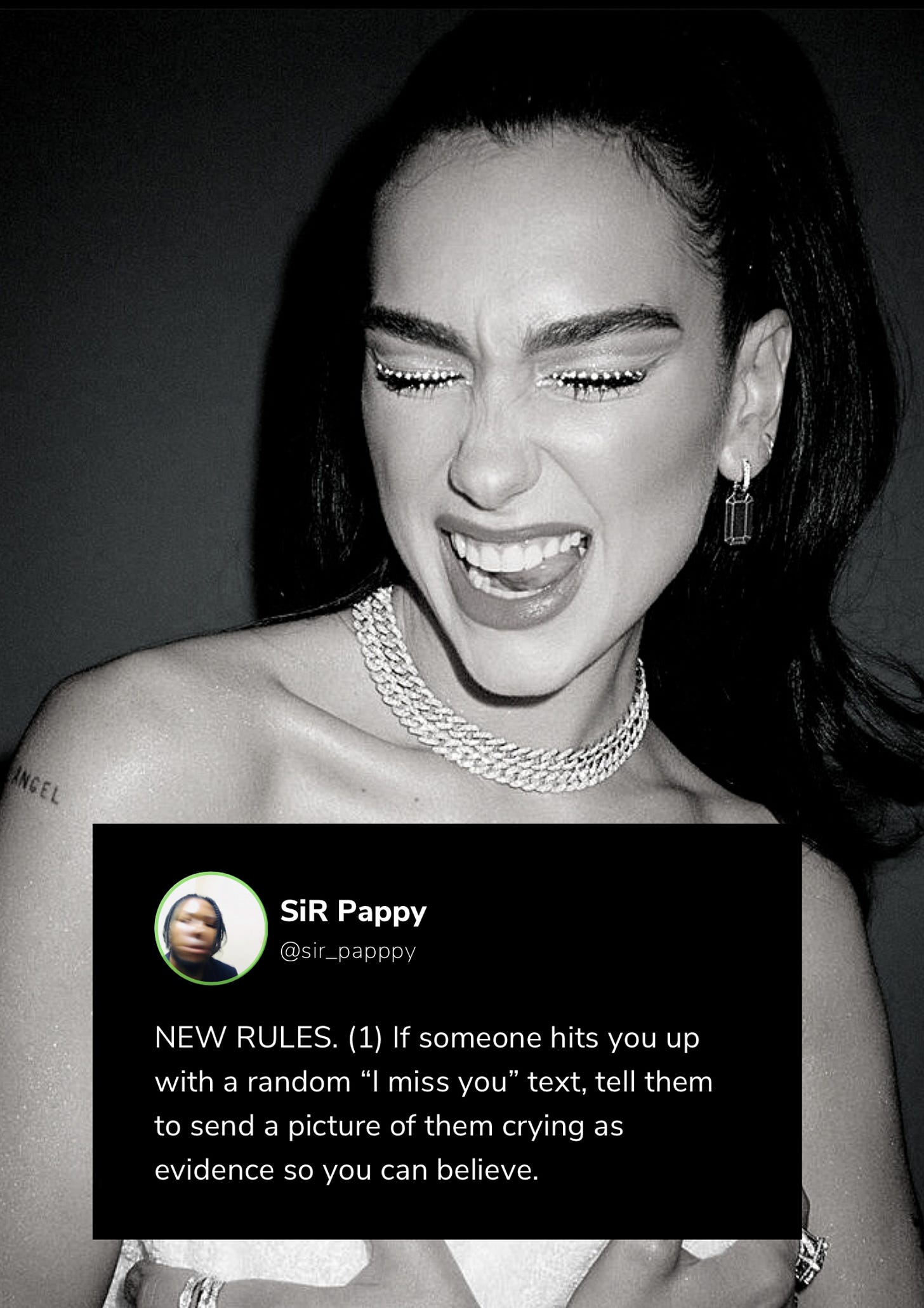 13. I celebrate you. Foolish people need to be celebrated too, you can see through the bullshit so celebrate them and say well-done. You once exhibited ‘mumu’ traits but does that make you a mumu? No, See I am giving these new rules and advice because I don’t judge you and ‘cause this is a safe space. If you like say, ‘I miss you too’ or ‘I miss you more’, That makes you a mumu for life. Once a mumu, always a mumu.